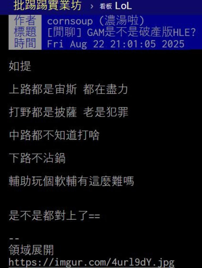 Trong một bài viết với tên gọi “GAM Esports LoL = Hanwha Life Esports phiên bản cấp thấp?”. Một người dùng trên diễn đàn PTT của Đài đã thắc mắc về việc đội hình GAM có cấu trúc khá giống với HLE hiện tại như sau :