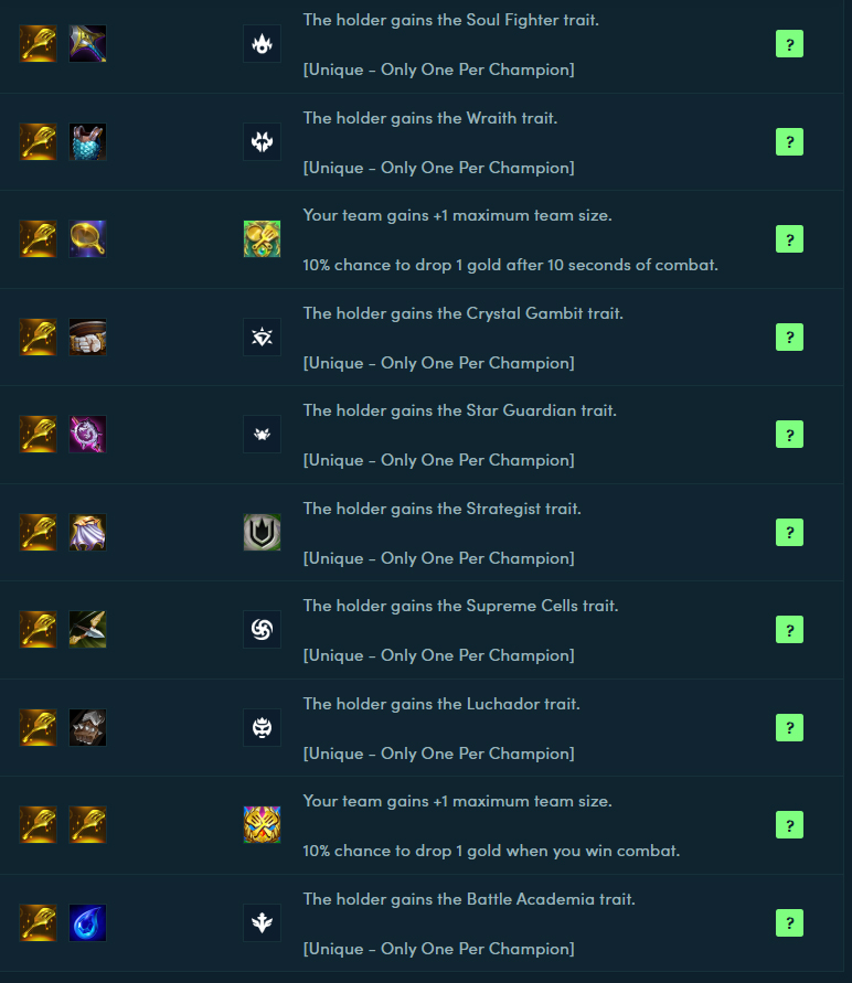Xẻng Vàng + Xẻng Vàng = Vương Miện Chiến Thuật (+1 kích cỡ đội hình, 10% cho 1 vàng sau 10 giây giao tranh)