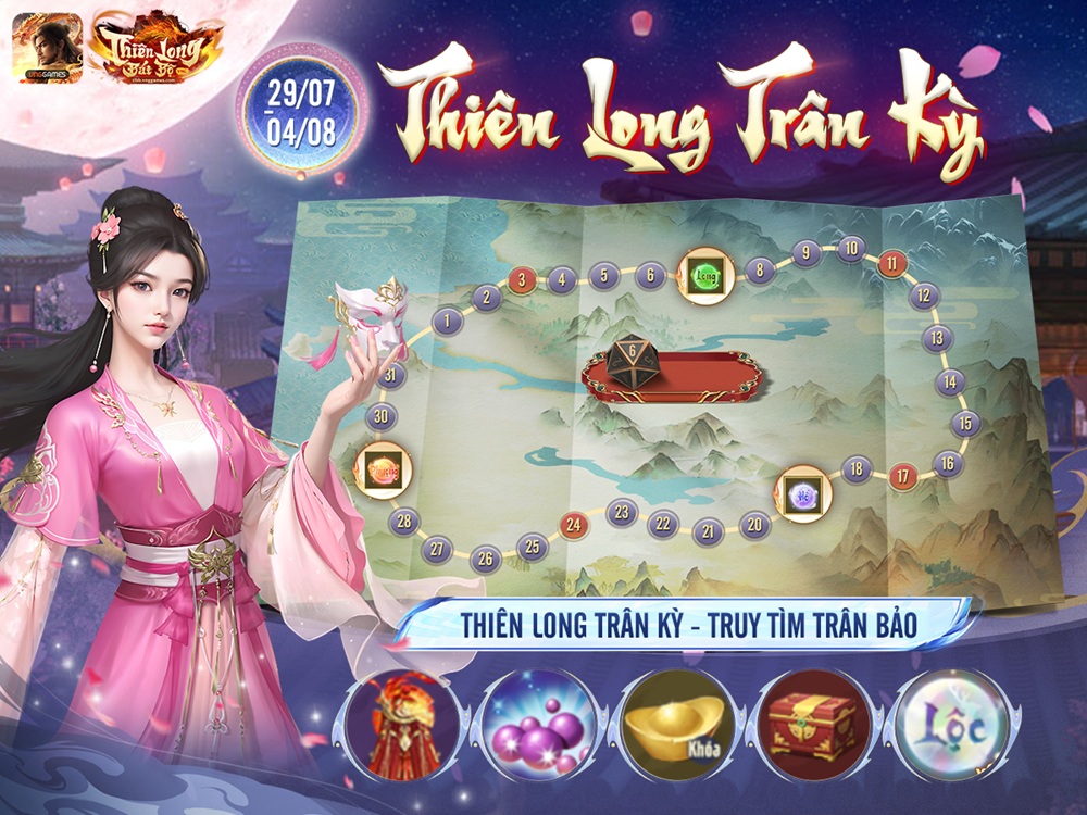 Ngoài ra, đông đảo người chơi còn có cơ hội tham gia sự kiện Thiên Long Trân Kỳ – Một sân chơi đầy bất ngờ và hấp dẫn diễn ra từ 29/7 – 4/8/2025. Người chơi chỉ cần nhận lượt tung xúc xắc miễn phí mỗi ngày và đi đến các mốc trên bản đồ để nhận được các phần thưởng tương ứng như: Phi Phong Phượng Vũ Lưu Kim, các bảo vật hiếm và nhiều phần thưởng giá trị khác. Đừng bỏ lỡ cơ hội thử vận may, khẳng định phong thái đỉnh cấp của một cao thủ thực thụ trong thế giới Thiên Long Bát Bộ VNG.