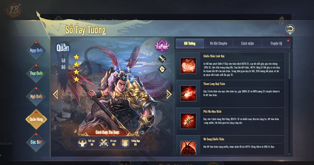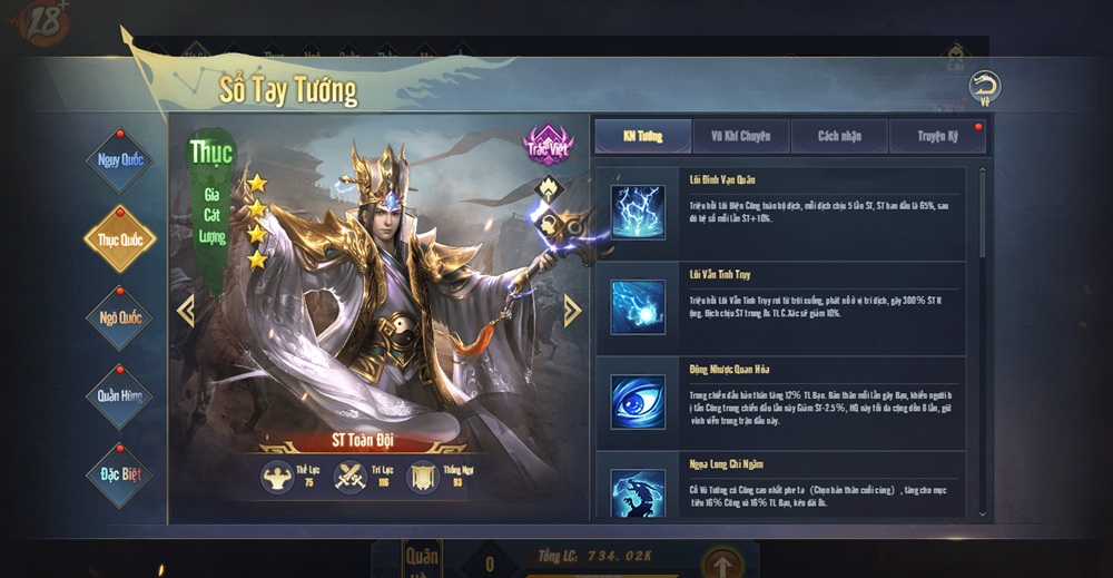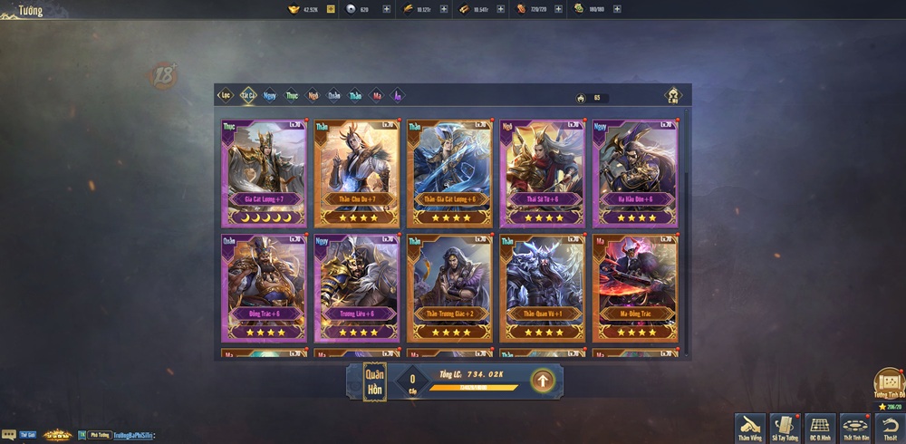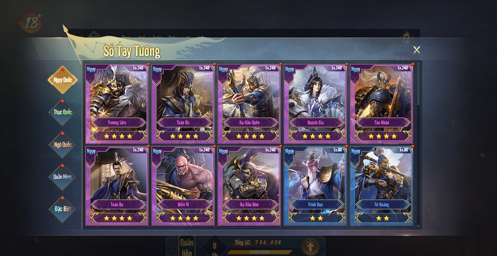 Hệ thống tướng đa dạng với hàng trăm danh tướng nổi tiếng Tam Quốc, đồng thời chia làm 7 phe Ngụy, Thục, Ngô, Quần, Thần, Ma, Ẩn, mỗi tướng sở hữu kỹ năng riêng biệt, tạo ra vô số biến hóa trong chiến thuật.