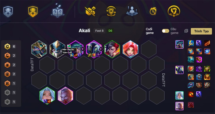 Đội hình Akali Hộ Vệ sẽ áp dụng chiến thuật Fast 8. Ưu tiên hàng đầu là Kayle và Cuồng Đao sớm kết hợp Thức Tỉnh Ngón Đòn Hoàng Kim nhằm tích vàng. Ưu tiên hàng đầu là luôn eco lợi tức trong mọi trường hợp. Các Hộ Vệ 1 vàng như Kennen hay Malphite sẽ được giữ lại để đội hình của bạn đảm bảo mốc 6 Hộ Vệ.