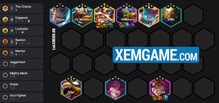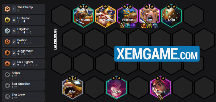 Về trang bị thì Volibear sẽ theo phong cách sát thủ vật lý với Vô Cực + Chùy và món bảo hiểm Áo Choàng Bóng Tối. Trong khi đó Samira có thể cầm các món STVL dư ra và Sett và Braum chia nhau các món tank còn lại.