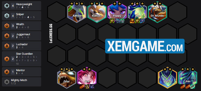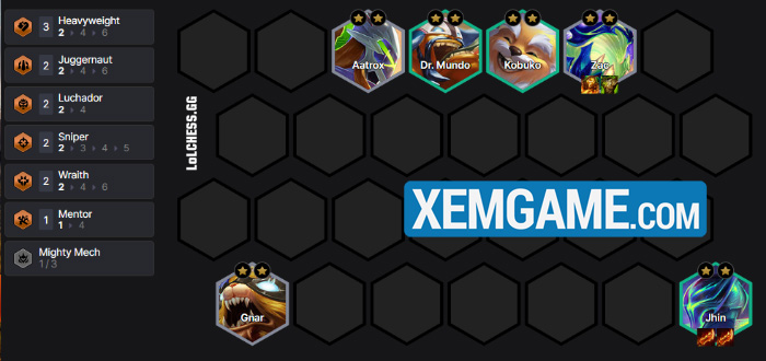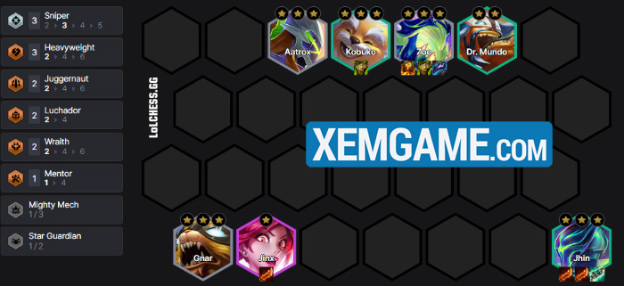 Ở cấp 7 sau khi roll Jhin 3 sao và ít nhất Kobuko hay Zac 3 sao, thì chúng ta sẽ có 4 Hạng Nặng hoặc 3 Bắn Tỉa :