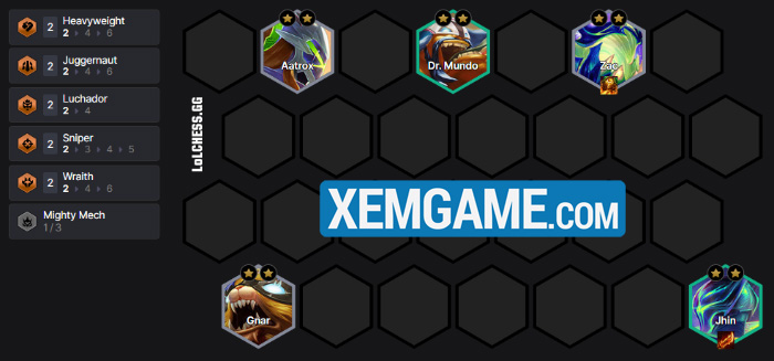 Khởi đầu, như mọi bài reroll khác chúng ta sẽ chốt bài từ rất sớm với dàn tướng 1-2 vàng rẻ bao gồm Bắn Tỉa : Gnar – Jhin, Hạng Nặng và mảnh ghép Mundo sẽ kích tròn hệ Dũng Sĩ và Đô Vật :