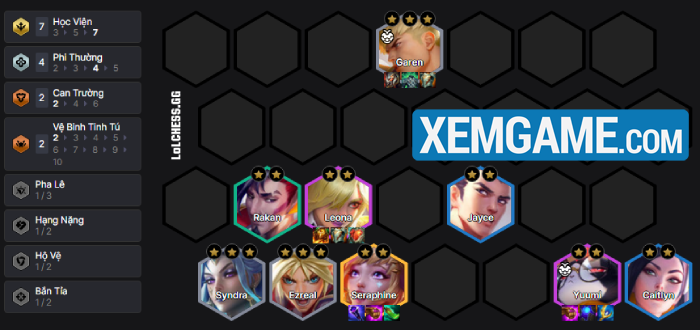 Theo đó, chúng ta sẽ reroll bộ đôi 1 vàng Garen, Ezreal (và phần nào đó Syndra) ở cấp độ 5. Chúng sẽ là nền tảng giúp bạn hướng đến 7 Học Viện ở cấp 8 với những vị tướng còn lại trong bộ là Rakan, Jayce, Caitlyn, Yuumi, Leona… Nếu có cơ hội thì up thẳng 9 để tìm Seraphine và chuyển đồ/Thức Tỉnh Ezreal sang cho Yuumi (đã nâng cấp) để đánh late game :