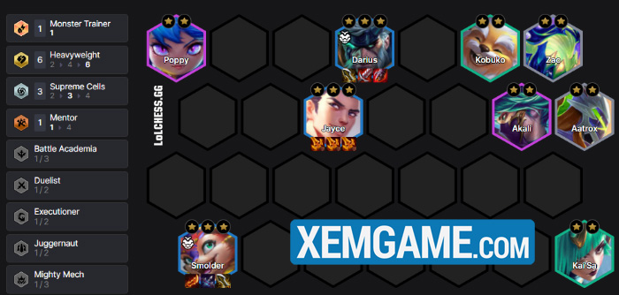 Khung bài này sẽ xoay quanh 6 vị tướng Hạng Nặng là Darius, Jayce, Kobuko, Zac, Aatrox, Poppy, tướng có thể roll cùng ở 6-7 chính là Smolder vì cung cấp hiệu ứng đốt, cũng như có thêm 1 carry hàng sau khỏe. 2 slot còn lại thì là Hội Tối Thượng với Akali và Kai’Sa.