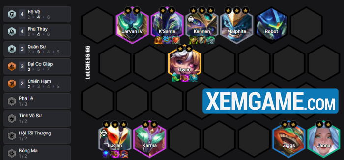 Về khung bài thì chúng ta sẽ slowroll Kennen và Lucian ở 5 trước khi up cấp trở lại đánh 4 Hộ Vệ 4 Pháp Sư quen thuộc với 4 Hộ Vệ là Kennen, Malphite, K’Sante, Janna còn 4 Pháp Sư là Lucian, Kennen, Karma, Gwen. Các tướng còn lại là bộ Quân Sư với Ziggs, Jarvan kích Đại Cơ Giáp để tròn bài.