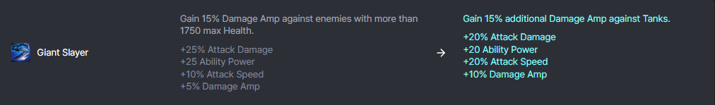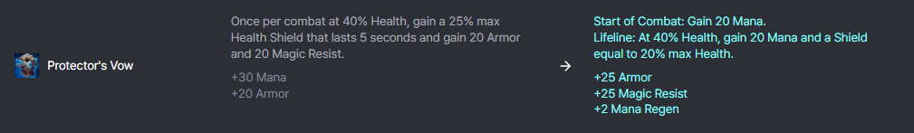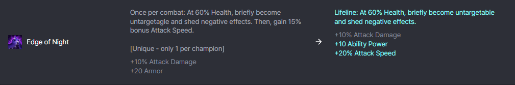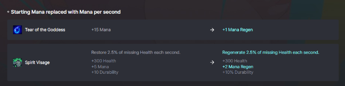 - Hiệu ứng nhận lá chắn, giáp kháng phép khi dưới số Máu được thay bằng nhận 20 năng lượng và vẫn tạo lá chắn nhưng số lượng nhỏ hơn, không còn thêm giáp/kháng phép nữa.