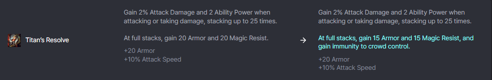- Khi ở mốc cộng dồn tối đa, nhận 15 giáp/kháng phép và thêm hiệu ứng miễn trừ khống chế