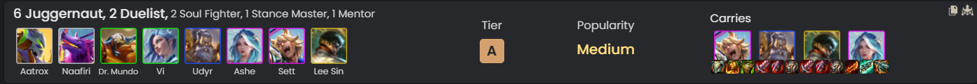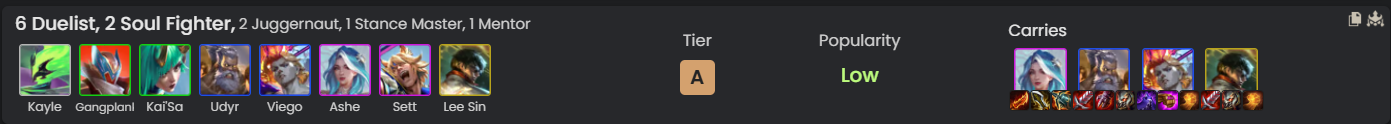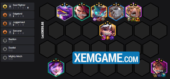 Tinh Võ Sư là một Tộc có 8 mốc và đủ 8 vị tướng trong Tộc, cung cấp rất nhiều lựa chọn liên quan đến việc flex Hệ. Điều đầu tiên cần lưu ý là đã có một số Hệ trùng lặp đầu tiên là đội hình sẽ có sẵn hai Dũng Sĩ làm tuyến đầu của mình với Naafiri và Sett. Ngoài ra còn có Lux Phù Thủy và Gwen, với Gwen là lựa chọn carry cực mạnh ở mốc 5 vàng.