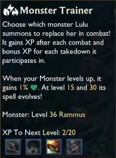Cụ thể Tộc Luyện Quái đến từ vị tướng Lulu nhưng Lulu sẽ không trực tiếp tham chiến mà cho người chơi chọn 1 trong 3 quái vật dưới đây để đánh thay, còn mình đứng ngoài cổ vũ. Bạn vẫn có thể lắp đồ cho các con quái vật như tướng thường vậy :