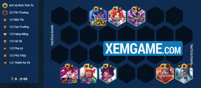 Cách xây dựng phổ biến của đội hình vẫn sẽ là fast 8 và 9, kẹp nhiều quân cờ VBTT nhất có thể. Các bạn có thể giữ máu và ghép sớm cho các VBTT rẻ tiền như Syndra, Xayah, sau đó lên cấp swap sang cho Ahri và Jinx. Khi lên 9 sẽ kẹp thêm các vị tướng 5 vàng 2 sao như Braum giúp gia tăng khống chế và chống chịu cho đội hình là hoàn thành.
