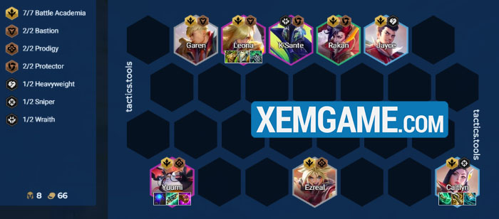 Lối chơi của Học Viện cũng sẽ là fast 8 và hoàn thành đội hình. Trước đó các bạn có thể def bằng Ezreal và Garen sau đó lên cấp và đổi đồ cho Yuumi và Leona. Roll full khung bài 2 sao bao gồm: Garen, Ezreal, Rakan, Jayce, Caitlyn, Yuumi, Leona. Các slot còn lại có thể kẹp K’Sante + Varus hoặc thêm Phi Thường nếu có nhiều trang bị phép.