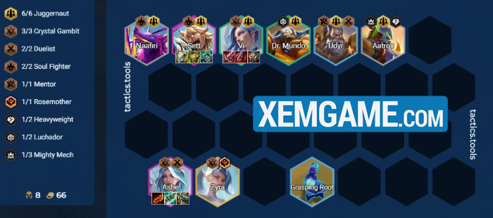 Sẽ có hai lối chơi chính phụ thuộc vào việc chúng ta có sử dụng Lulu với Smolder hoặc Kog’Maw hay không. Có sẽ là khung bài ở 7 rồi mới lên 8, Smolder đang là lựa chọn có sát thương tốt hơn nhưng nếu dư trang bị phép thì Kog’Maw cũng không phải lựa chọn tồi. Ra nhiều có thể đánh 3 sao, nếu không sẽ là fast 8 và hoàn thành đội hình bao gồm: Naafiri, Aatrox, Mundo, Vi, Udyr, Sett, Ashe và Zyra.