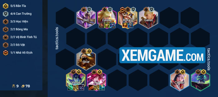 Điểm mạnh của các đội hình kết hợp 44 luôn là khả năng xây dựng nhất quán trong các giai đoạn của ván đấu. Chúng ta sẽ ưu tiên giữ máu bằng những Sivir, Gnar, tank bằng Garen, Rell, ghép sớm các trang bị rồi lên thẳng 8. Sau đó sẽ là đổi đồ cho các vị tướng 4, 5 vàng là hoàn thành. Khung bài full hệ bao gồm: Gnar, Garen, Rell, Jhin, Caitlyn, Leona, Jinx, Varus và Braum.