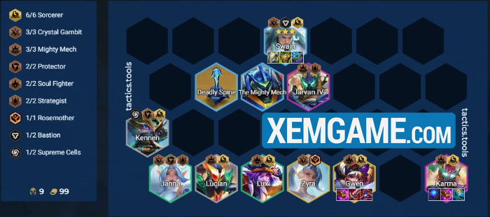 Là một đội hình thuần sát thương phép, dấu hiệu nhận biết đội hình sẽ là việc game cho các bạn nhiều trang phép cũng như khung bài từ sớm. Các bạn có thể ghép cho bất kỳ vị tướng nào như Lucian, giữ máu và lên cấp khung bài. Đội hình hoàn chỉnh bao gồm: Lucian, Kenne, Janna, Lux, Swain, Karma, Jarvan IV, Gwen và Zyra. Gwen 2 sao hoặc Swain 3 sao sẽ là điều kiện để có thể đạt top 1.