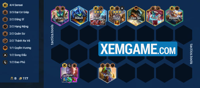 Về cách xây dựng, chúng ta sẽ ưu tiên lối chơi fast 8 để tìm kiếm Ryze 2 sao và khung bài mạnh mẽ nhất là 4 Sensei và 3 Đại Cơ Giáp. Sau đó lên cấp và roll 2 sao cùng đội hình bao gồm: Aatrox, Kobuko, Yasuo, Udyr, Ryze, Jarvan IV, Yone và Lee Sin. Nếu chưa có Yone có thể thay bằng Gangplank hoặc Senna là chúng ta cũng có thể kích bài full hệ.