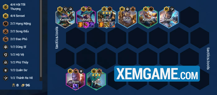 Về cách xây dựng, chúng ta sẽ ưu tiên lối chơi fast 8 để tìm kiếm Ryze 2 sao và khung bài bao gồm 4 Sensei và 3 Đại Cơ Giáp. Trước đó các bạn có thể ghép các trang bị phép sớm và giữ bằng các khung bài như Vệ Binh hoặc Lucian. Sau đó lên cấp và roll 2 sao cùng đội hình bao gồm: Aatrox, Kobuko, Yasuo, Udyr, Ryze, Jarvan IV, Yone và Lee Sin. Nếu chưa có Yone có thể thay bằng Gangplank hoặc Senna là chúng ta cũng có thể kích bài full hệ.
