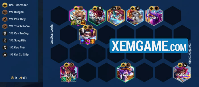 Cách xây dựng đội hình khá cơ bản khi chúng ta sẽ ưu tiên khởi đầu bằng Tinh Võ Sư, ghép các trang bị sát thương vật lý cho Kalista, chống chịu cho Naafiri và lên thẳng cấp độ 8. Sau đó sẽ roll khung bài 8 Tinh Võ Sư với thêm các quân cờ là Lux, Xin Zhao, Viego, Samira, Sett và Gwen. Các trang bị sẽ được swap cho Sett, Samira và Gwen, đồng thời lên 9 kẹp Yone là hoàn thành đội hình.