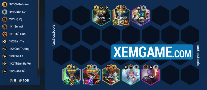 Là một đội hình thuần roll nên nếu có các lõi roll sớm hoặc một trong hai nâng cấp của Chiến Hạm sẽ là điều kiện tốt để chốt bài. Chúng ta sẽ ưu tiên slow roll ở hai cấp độ là 5 và 7 sẽ là tối ưu nhất. Tại cấp độ 5 sẽ roll Malphite và Sivir 3 sao, bắt một vài con Shen và cấp độ 7 là Ziggs và roll nốt những vị tướng Shen còn lại. Khung bài đầy đủ sẽ kết hợp thêm các tướng Quân Sư là Janna, Jarvan và Ryze cùng Twisted Fate. Nếu có TF 2, ưu tiên đổi đồ Sivir sang vì quân cờ này sẽ hơi đuối vào cuối trận.
