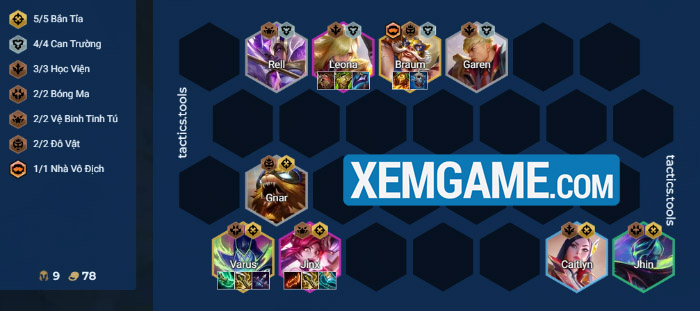 Điểm mạnh của các đội hình kết hợp 44 luôn là khả năng xây dựng nhất quán trong các giai đoạn của ván đấu. Chúng ta sẽ ưu tiên giữ máu bằng những Sivir, Gnar, tank bằng Garen, Rell, ghép sớm các trang bị rồi lên thẳng 8. Sau đó sẽ là đổi đồ cho các vị tướng 4, 5 vàng là hoàn thành. Khung bài full hệ bao gồm: Gnar, Garen, Rell, Jhin, Caitlyn, Leona, Jinx, Varus và Braum.
