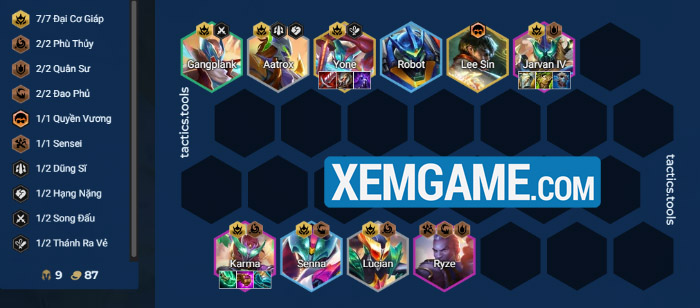 Sở hữu tỉ lệ thắng và top 4 gần như là dẫn đầu meta nhưng Đại Cơ Giáp sẽ yêu cầu một điều kiện tiên quyết là phải có Yone để kích hoạt 7 Đại Cơ Giáp. Lối chơi quen thuộc vẫn sẽ là fast 8 và roll khung bài 2 sao vì Garen cũng sẽ mạnh lên theo cấp sao của tướng. Sau đó chúng ta sẽ lên 9, tìm kiếm Yone 2 sao và hoàn thành khung bài bao gồm: Aatrox, Lucian, Gangplank, Senna, Karma, Ryze, Jarvan IV, Yone và Lee Sin hoặc Gwen tùy thuộc vào trang bị còn lại.