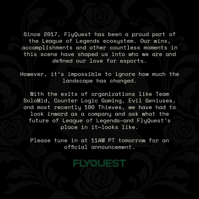 Cụ thể thì đương kim vô địch LTA – FlyQuest mới đây đã đăng 1 thông báo đầy ẩn ý trong đó nêu ra thực trạng rằng nhiều tổ chức Esports nổi danh thế giới 1 thời như Team SoloMid (TSM), Counter Logic Gaming (CLG), Evil Geniuses hay mới đây là 100 Thieves đã phải rời bỏ giải đấu LCS (rồi LTA) do môi trường kinh doanh bất lợi và một tương lai thiếu triển vọng.
