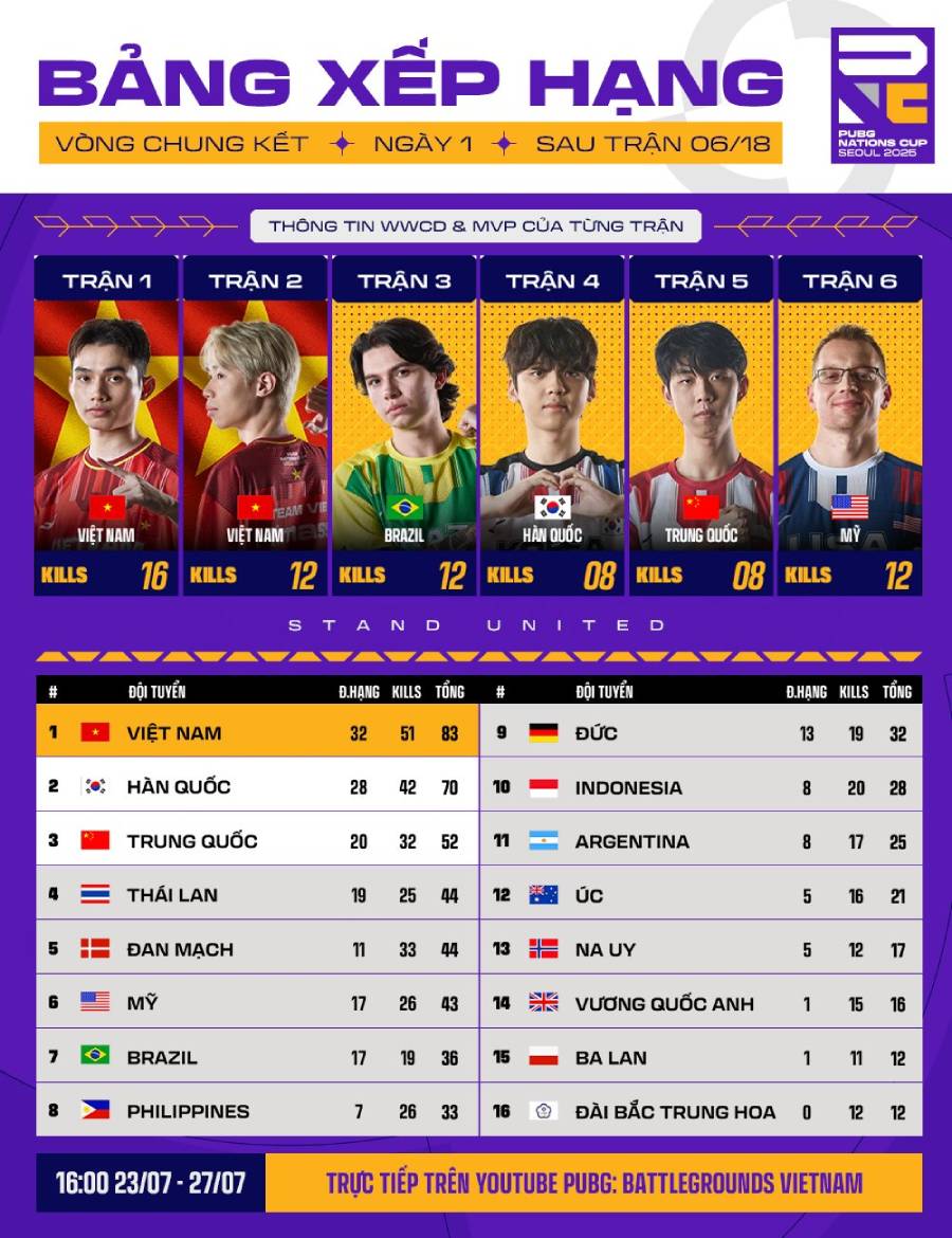 Ở map thi đấu cuối cùng, Việt Nam giành Top 3 với 6 Kills ở trận 06/18 để kết thúc ngày đầu ở hạng 1 trên bảng xếp hạng tổng với 83 điểm, qua đó trở thành đội tuyển ghi nhiều điểm nhất trong 1 ngày.