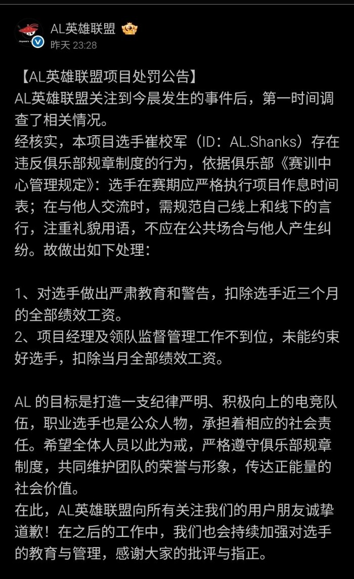 - Nghiêm khắc răn đe và cảnh cáo tuyển thủ, đồng thời trừ toàn bộ tiền lương hiệu suất của tuyển thủ Shanks trong ba tháng gần nhất.
