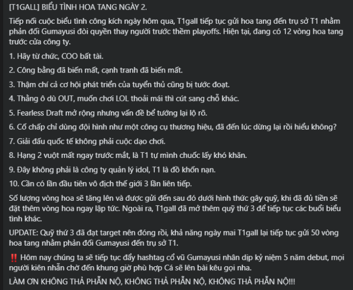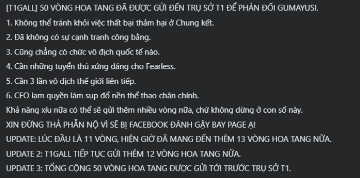 Cụ thể thì trong ngày hôm qua, T1Gall đã liên tục spam nhiều đợt vòng hoa đến trụ sở T1 với số lượng lên đến 50 vòng chỉ trong 1 ngày. Trước đây thì việc gửi hoa tang khá lẻ tẻ và thường chỉ có 1 đợt rồi hết, nhưng T1Gall vừa gây quỹ được một khoảng hỗ trợ lớn từ cộng đồng anti để có thể chơi lớn như thế này. Theo đó, các thông điệu công kích được gửi kèm đến có nội dung khá quen thuộc khi “chê” bể tướng Gumayusi đồng thời yêu cầu BLĐ thay người để có kết quả tốt hơn.