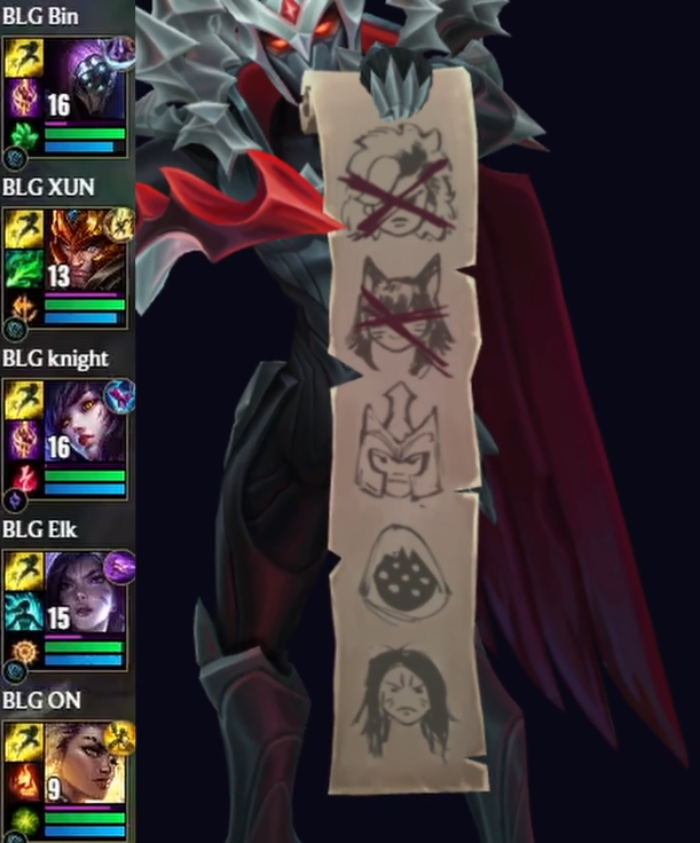 Pyke khi Khiêu Khích sẽ kéo ra một danh sách những vị tướng và dựa vào những hình ảnh chúng ta có thể thấy đó là bộ tướng mà BLG đã từng sử dụng trong ván 5 của chung kết. Đồng thời danh sách gạch mặt – hay tiêu diệt cũng trùng khớp với thứ tự ngã xuống của từng người trong BLG ở giao tranh quyết định cuối trận.