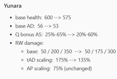 Với khả năng gánh đội vượt trội và tỉ lệ xuất hiện cao trong khâu cấm/chọn, đặc biệt là nó chứng tỏ sức mạnh ở những khu vực khó nhằn như LPL và LCK. Riot Games quyết định giảm khá nhiều sức mạnh của Yunara để cho các Xạ Thủ khác có cơ hội tỏa sáng :