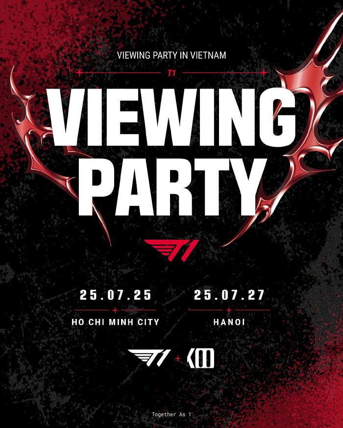 Cụ thể, T1 đã thông báo về việc sẽ tổ chức Viewing Party tại 2 thành phố lớn ở Việt Nam lần lượt là Hồ Chí Minh vào ngày 25/7/2025 và Hà Nội vào ngày 27/7/2025 sắp tới (ở Hàn ngày và tháng sẽ viết ngược).