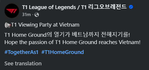 Tuy nhiên bên cạnh giải đấu trên, các fan của T1 tại Việt Nam lại có một sự kiện khác để theo dõi khi mới đây trang Facebook chính thức của T1 đã bất ngờ thông báo về một sự kiện sẽ được tổ chức ngay tại mảnh đất hình chữ S :