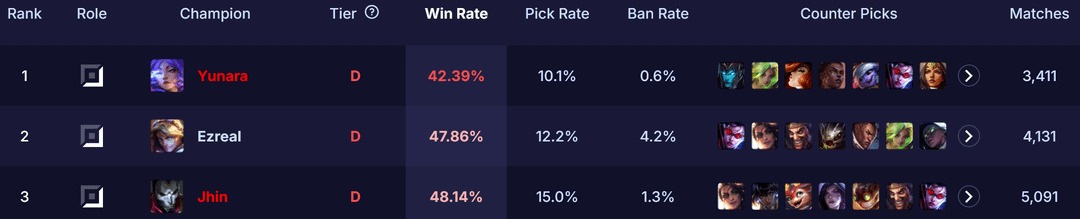 Theo đó Yunara hiện tại chỉ mới có 42.39% tỉ lệ thắng, tệ hơn nhiều so với những vị tướng khác cùng vị trí dù số lượng trận đấu cũng khá tương đồng.