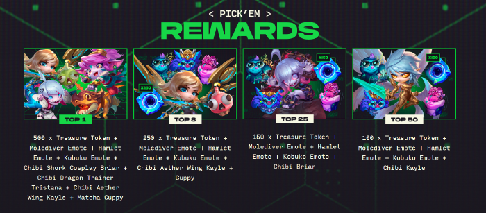 Mới đây, sự kiện Pick’Ems cho CKTG của ĐTCL Thành Phố Công Nghệ sắp tới cũng đã lộ diện hàng loạt phần thưởng hấp dẫn như sau :