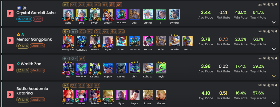 Về đội hình, Pha Lê đang có tỉ lệ top 1 cao nhất, những bài đấu mạnh và đang được cạnh tranh là Phù Thủy, Gangplank Sensei, Yuumi, Kayle và K’Sante.