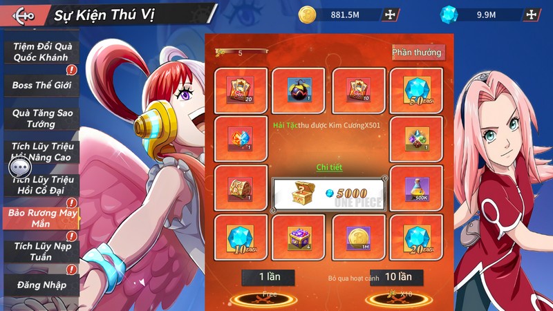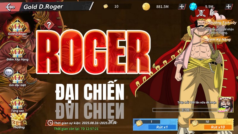Để chào đón sự kiện trọng đại này, Tứ Hoàng Hỏa Quốc mang đến chuỗi sự kiện độc quyền cho phép người chơi sở hữu và nâng cấp Vua Hải Tặc. Sự kiện Đua Top Chiêu Mộ sẽ là một cuộc cạnh tranh khốc liệt để xem ai là người đầu tiên chiêu mộ được huyền thoại. Cùng với đó, Gói Đặc Biệt và sự kiện Quà Tăng Sao Gol D. Roger sẽ là con đường nhanh nhất giúp người chơi tối ưu hóa sức mạnh của vị tướng SSS này, sẵn sàng thống lĩnh mọi đấu trường.