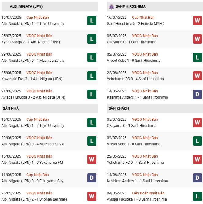 Thống kê phong độ Albirex Niigata vs Sanfrecce Hiroshima:
