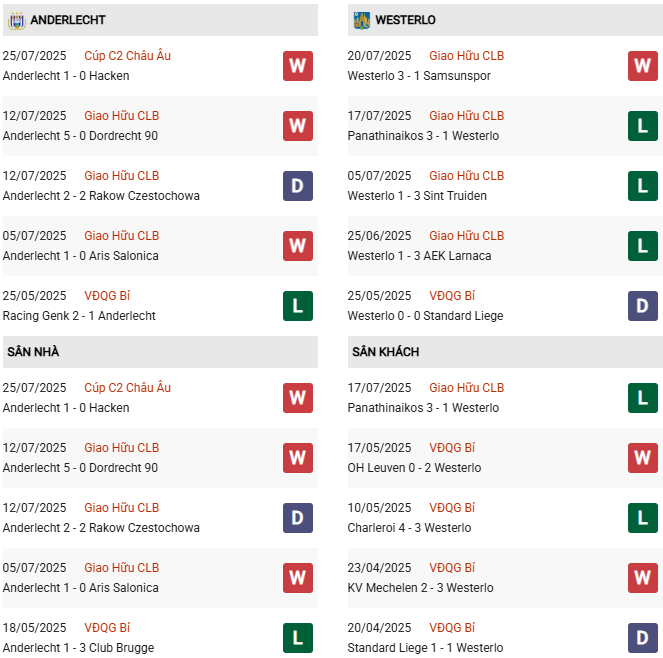 Với Westerlo thì đây mới là màn so tài chính thức đầu tiên. Westelo vừa trải qua 7 trận giao hữu với kết quả: thắng 3, thua 4.
