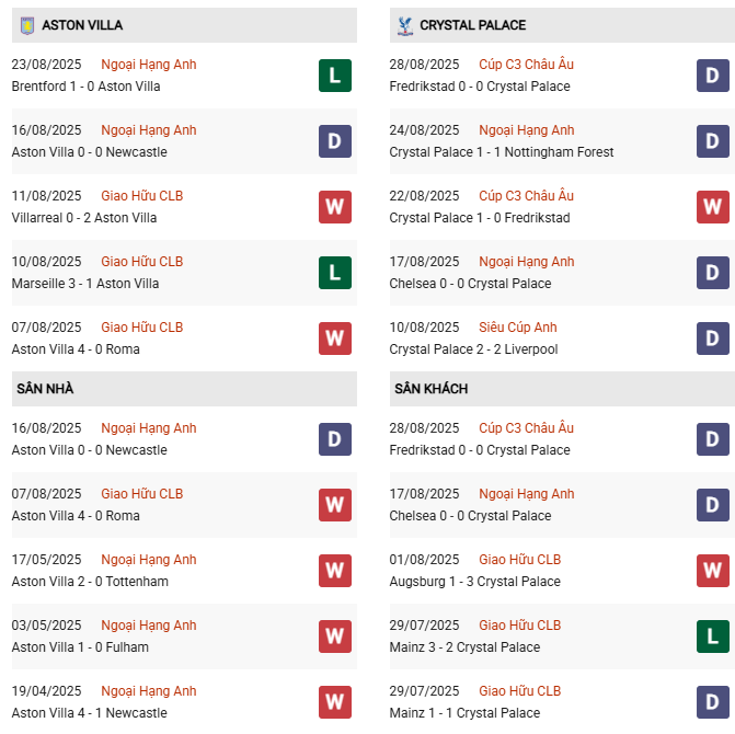 Phong độ sân nhà của Aston Villa gần đây được cải thiện, đặc biệt là trận thắng Roma 4-0. Nhưng nếu so với sự vững vàng của Palace trên sân khách – nơi họ từng cầm hòa Chelsea, Fredrikstad và thắng Crawley 3-0 – thì ưu thế của đội chủ nhà chưa thực sự rõ ràng. Chưa kể thành tích đối đầu cũng cho thấy Aston Villa thường gặp khó khăn khi chạm trán Crystal Palace, với 5 trận liên tiếp không thắng.