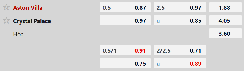 Giới chuyên gia đưa ra mức kèo Aston Villa chấp 0:1/2, phản ánh lợi thế sân nhà của thầy trò Unai Emery, đồng thời đánh giá cao yếu tố cổ vũ từ khán đài Villa Park. Tuy nhiên, sự chênh lệch này không hẳn dựa vào phong độ, bởi nếu nhìn vào kết quả thực tế, Crystal Palace mới là đội tỏ ra ổn định hơn. Họ bất bại ở cả 4 trận chính thức mùa này, bao gồm cả hai lượt trận Conference League và hai vòng Premier League. Trong khi đó, Aston Villa đã trải qua khởi đầu chệch choạc khi chưa ghi nổi bàn thắng nào ở Premier League sau 2 vòng.