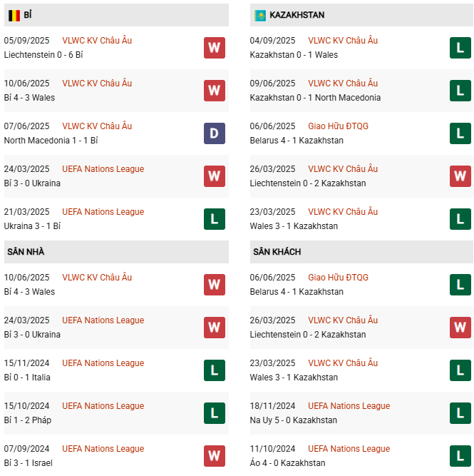 Thống kê phong độ Bỉ vs Kazakhstan: