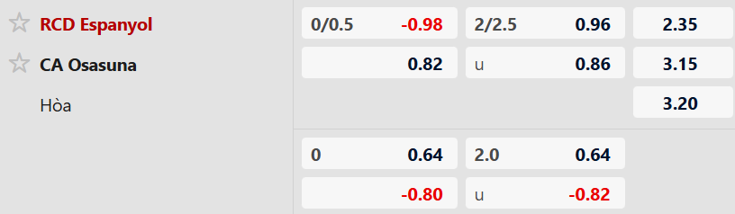 Tỷ lệ tài xỉu của trận đấu này được đưa ra ở mức thấp là 2 1/4, phản ánh xu hướng thận trọng thường thấy khi Espanyol và Osasuna gặp nhau. Thực tế, trong những lần đối đầu gần đây, số bàn thắng thường không quá cao, nhiều trận khép lại với tỉ số hòa 0-0 hoặc 1-1. Tuy nhiên, đặt trong bối cảnh mùa này, cục diện có thể thay đổi.