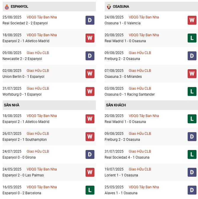 Trong khi đó, nhìn vào phong độ sân khách của Osasuna, rõ ràng những con số không mấy ấn tượng. Đội bóng này không thắng trong 5 chuyến hành quân gần nhất, chỉ hòa 2 và để thua 3. Những thất bại nặng như 1-4 trước Real Sociedad cho thấy hàng thủ của họ dễ bị tổn thương trước sức ép lớn. Trái ngược, Espanyol lại đang cho thấy sự hiệu quả trong khâu ghi bàn khi nổ súng đều đặn trong các trận sân nhà, bao gồm cả trận thắng 2-1 trước Atl. Madrid.