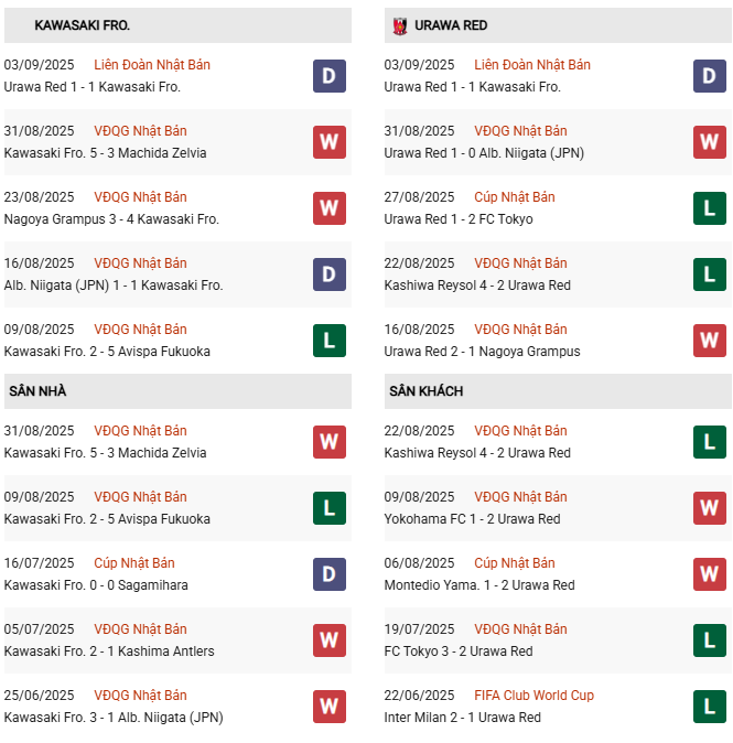 Thống kê phong độ Kawasaki Frontale vs Urawa Red Diamonds: