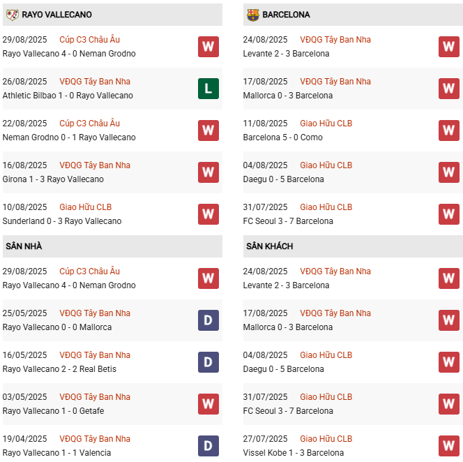 Thành tích đối đầu Rayo Vallecano vs Barcelona: