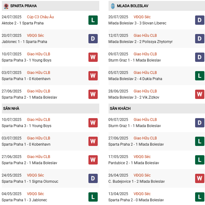 Bên cạnh đó, Mlada Boleslav đang thể hiện phong độ sân khách đáng lo ngại với 2 thất bại trong 3 trận gần nhất, trong đó đều để lọt lưới từ 2 bàn trở lên. Trong khi đó, Sparta dù không có phong độ ổn định trên tổng thể nhưng vẫn biết cách tận dụng lợi thế sân nhà, ghi 6 bàn trong 2 trận giao hữu gần nhất tại đây.