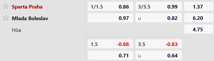 Giới chuyên gia đưa ra mức chấp cao 0:1 1/2 cho Sparta Prague là hoàn toàn hợp lý nếu xét đến sự vượt trội trong đối đầu cũng như yếu tố sân bãi. Việc đội chủ nhà toàn thắng trong cả 4 lần gần nhất tiếp đón Mlada Boleslav là minh chứng rõ rệt cho niềm tin mà giới mộ điệu dành cho họ.