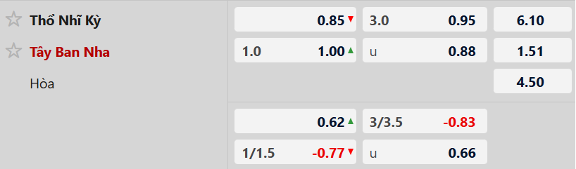 Các cầu thủ Tây Ban Nha để thua kèo châu Á 2, hòa 1 và thắng 1 ở 4 trận gần đây chấp dao động từ 1 đến 1 1/2 trái. Trận đối đầu gần nhất mà Tây Ban Nha chấp 1 1/4 trái như trận đấu này, họ chỉ thắng Thổ Nhĩ Kỳ tối thiểu. Trong khi đó, các cầu thủ Thổ Nhĩ Kỳ vượt handicap 4/5 trận vừa qua trên mọi đấu trường. Chọn: Thổ Nhĩ Kỳ.